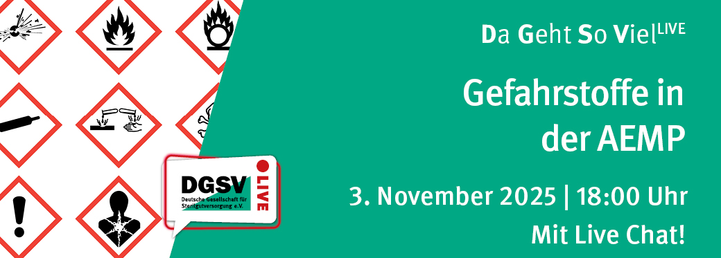 Mit Da Geht So Viel – Live werden wir in unregelmäßigen Abständen passend zu den aktuellen Veröffentlichungen unserer Fachausschüsse und Gremien in unserem Mitteilungsorgan, der Zeitschrift „Zentralsterilisation“ mit Experten, den Autoren und dem Vorstand der DGSV e.V. in einem Online-Talk sprechen.